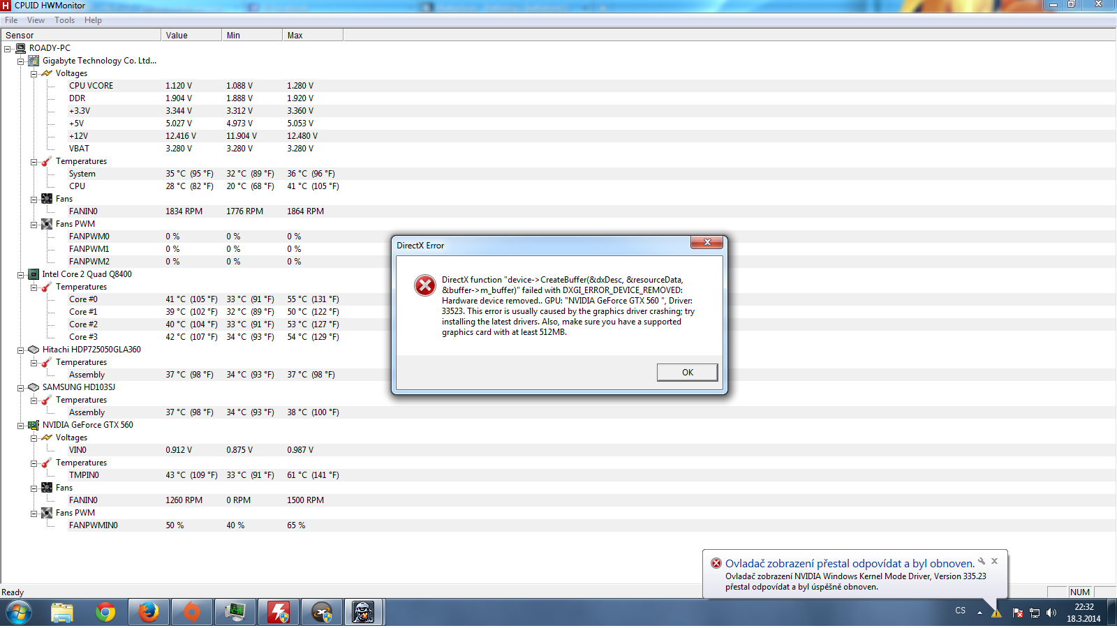 Device Removed = karta je nestabilní a může se přehřívat. Stáhni a spusť HWMonitor a hraj. Až ti hra spadne, tak nám ukaž screen s HW Monitorem. http://www.stahuj.centrum.cz/utility_a_ ... hwmonitor/