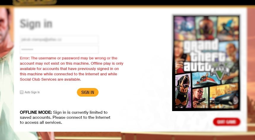 Ahoj, koupil jsem si na Steamu GTA V. Přihlásil jsem se se svými přihlaš. údaji a hrál, všechno šlo v pohodě. Zahrál jsem si úvodní misi, a pak jsem hru vypnul a šel ven. Když jsem ji večer zapnul znovu, ukázal se mi launcher a hra se spustila. Bohužel mě hra nepustila nikam dál než do uvítací obrazovky. RGSC chce abych se přihlásil, bohužel mi to po zadání údajů píše následující hlášku: The username or password may be wrong or the account may not exist on this machine. Offline play is only available for accounts that have previously signed in on this machine while connected to the Internet and while Social Club Services are available. Vím, že heslo i e-mail píšu správně, jelikož jsem to zkoušel jak v prohlížeči tak v RGSC pro GTA IV.
