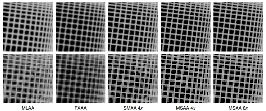 Existují i další metody anti-aliasingu. FXAA (fast approximate aa) funguje trošku jinak, je rychlejší a nevyžaduje tolik výpočetního výkonu. SSAA je prapůvodní přeškálování rastrového obrazu třeba na dvojnásobné rozlišení a vracení ho zpět na rozlišení tvého monitoru. Toto je výpočetně nejnáročnější řešení a v praxi takřka nepoužívané. Další metody, jako TXAA (jen nVidia) či SMAA jsou jen dalšími algoritmy, které řeší jak kvalitu výsledného obrazu, tak výpočetní náročnost.