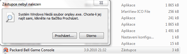 Z těch fotek jsem pochytil, že někde (asi na ploše) máš zástupce (odkaz) "Packard Bell Game Console" odkazující na soubor "onplay.exe" kdesi, ale už tam neni, tak se ho Windows snaží najít vyhledáváním, kdyby náhodou byl jen přemístěn. Zkus kliknout !pravým! myšítkem na ten odkaz "Packard Bell Game Console" a z nabídky vyber vlastnosti (uplně dole),... políčko "cíl" by bylo dobrý zkopčit a napsat sem nebo líp - zjistit jestli disk na který odkazuje je stejný jako disk který je v PC.