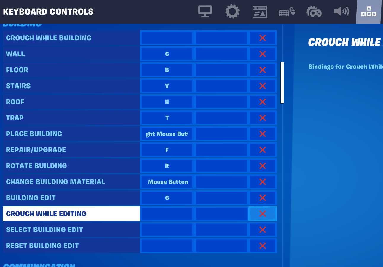 Ještě před týdnem toto fungovalo. Také nefunguje crouch while editing dohromady s crouch while building, to také dříve fungovalo.