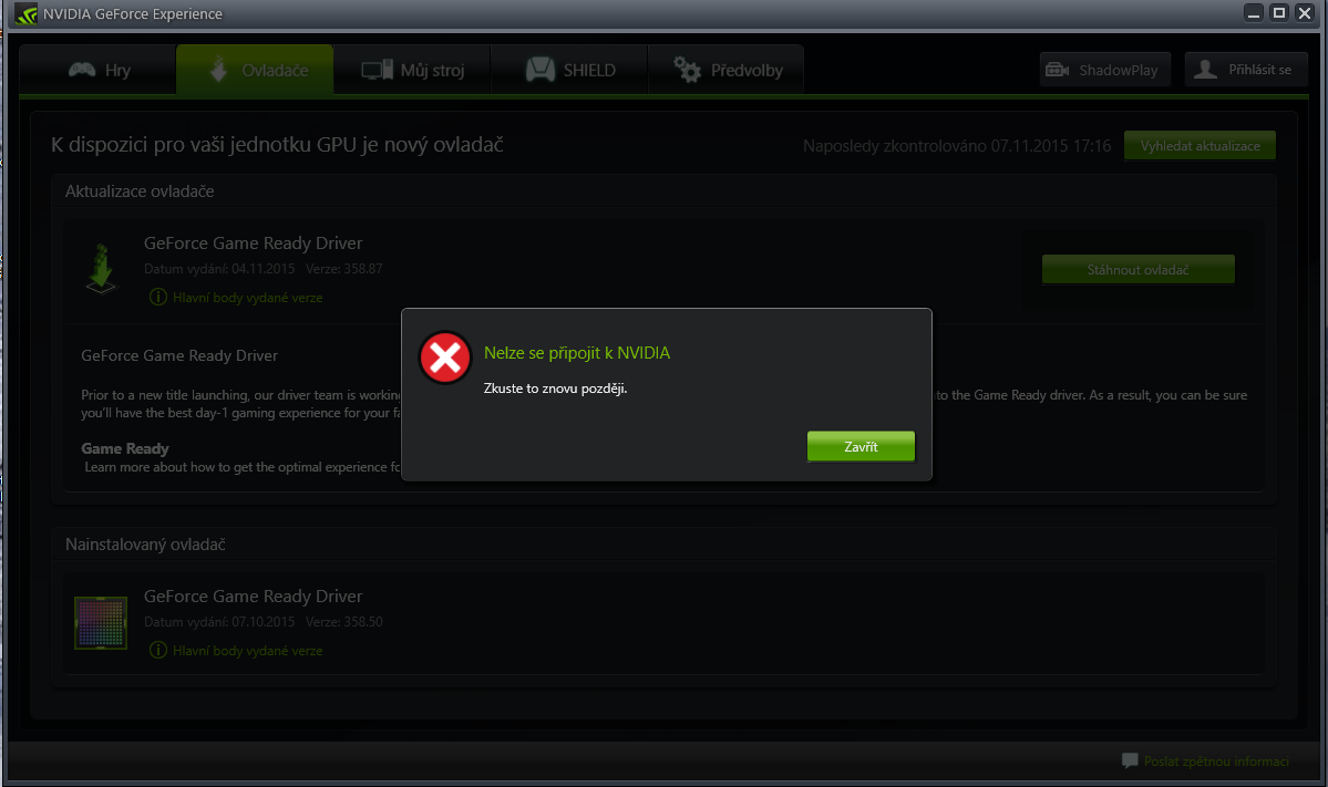 Nelze se připojit k NVidia - při snaze o aktualizaci