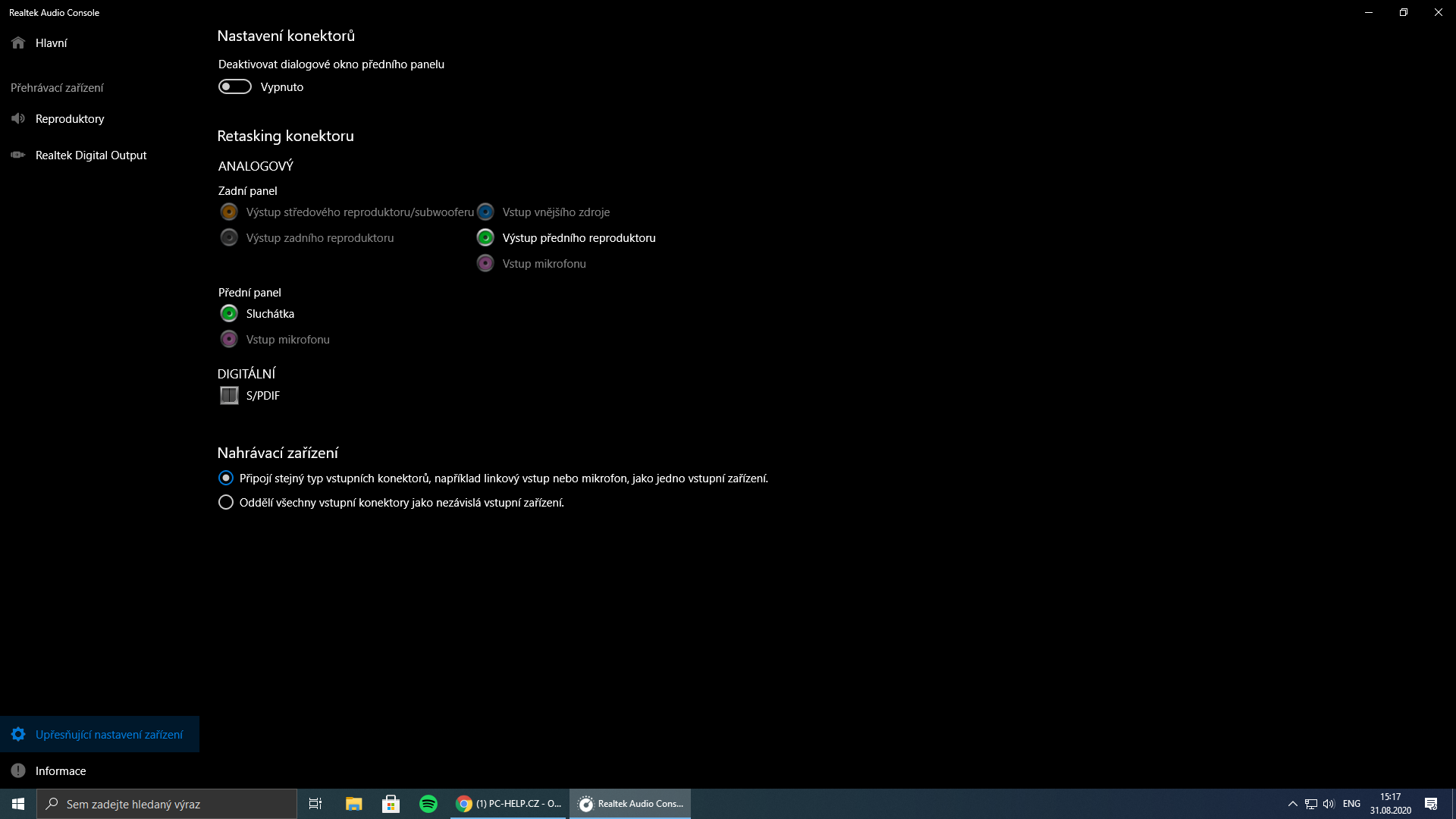 Jinak jak jsem psal, instalace, restart. Pak jsem musel ještě odpojit/zapojit konektor sluchátek a už se mi tam objevilo to nastavení. Jinak v tom nastavení od Realteku to bylo dycky, jenom to s každou aktualizací hodí někam jinam.
