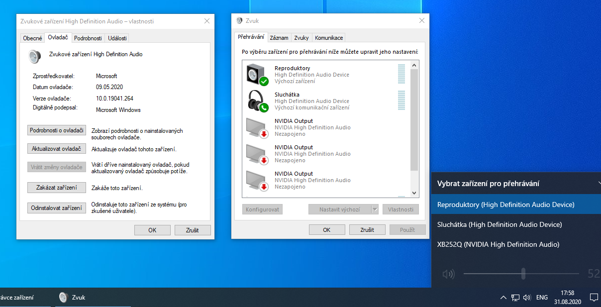 Realtek audio konsole od Microsoftu nepoužívám - odstranil jsem. Máš v ovládacích panelech položku "Správce zvuku Realtek HD"? Pokud ne, odsud stáhni a nainstaluj SW verze R2.82 https://www.tenforums.com/sound-audio/1 ... n-2-a.html, poté ve správci zařízení aktualizovat ovladač na 6.0.8963.1. Po restartu v ovládacích panelech klikni na položku "Správce zvuku Realtek HD" (již tam bude) a v nastavení označ volbu "Zařízení předního a zadního výstupu budou přehrávat simultárně dva proudy zvuku". Poté "Start - Nastavení - Systém - Zvuk". Hned nahoře je volba "Zvolit výstupní zařízení". Přehrává se zvuk z vybraného zařízení.