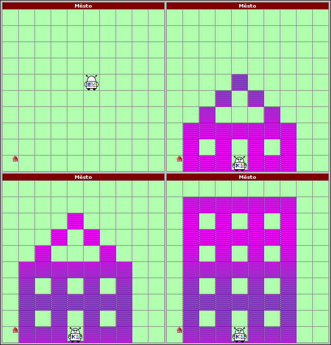2. Karel se může na začátku nacházet v libovolném místě města otočený do libovolného směru, takže ho musíš dostat do nějaké výchozí pozice, třeba levého dolního rohu (kde má svůj domov), ze které začne svojí práci. Tak jako první vytvoř příkaz DOMŮ.