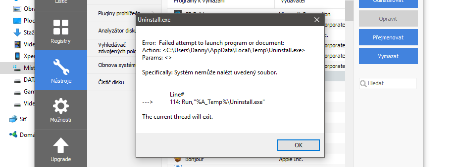 Zdravím, mám problém odinstalovat program Andy OS, hodí chybu a pak nereaguje. Zkoušel jsem i přes CCcleaner. Přikládám chybovou hlášku.
