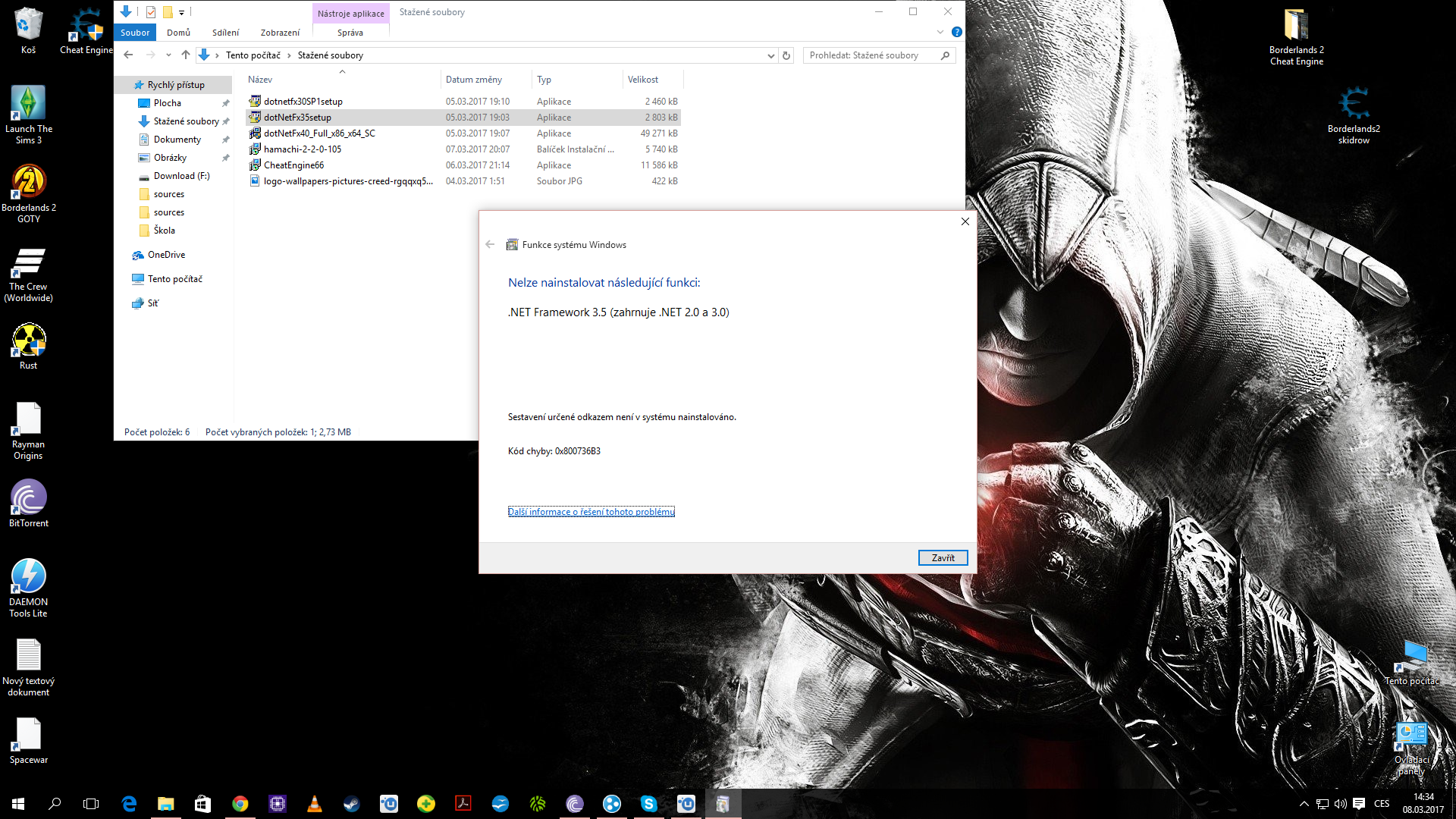 dism /online /enable-feature /featurename:NetFx3 /Source:Zde vložte jednotku ve které je install disk win 10:sourcessxs /all /LimitAccess