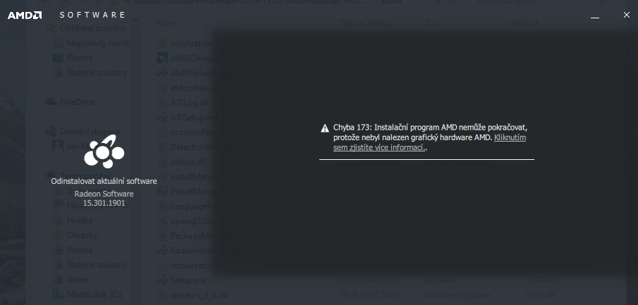 Dobrý den přeji všem, z důvodu mé demence jsem si odinstaloval ovladač externí grafické karty přes správce zařízení a nemohu ovladače nainstalovat, zkrátka se to nedaří a nebo jsem moc "ne-ajťák" na to abych to spravil sám. Zkoušel jsem stáhnout tyto ovladače ze stránky http://www.amd.com ale při instalaci mi to pouze nahlásilo chybu (viz. příloha) .Dále jsou zkoušel stáhnout ovladač ze stránek HP, ovšem také s nezdarem. Dále jsem vše aktualizoval (windows pomocí windows update, ostatní pomocí HP support assistant) Zkoušel jsem samozřejmě přeinstalovat windows ale výsledek stejný.