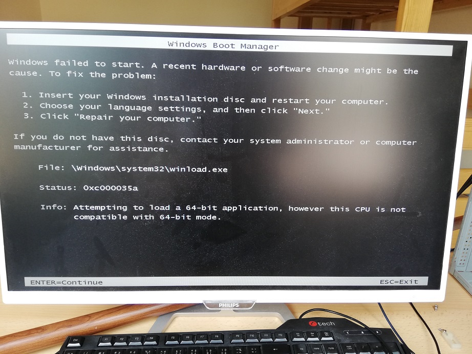 Procesor je z roku 2004, deska z roku 2002, na tom nikdy nemohly fungovat 64bit Windows,