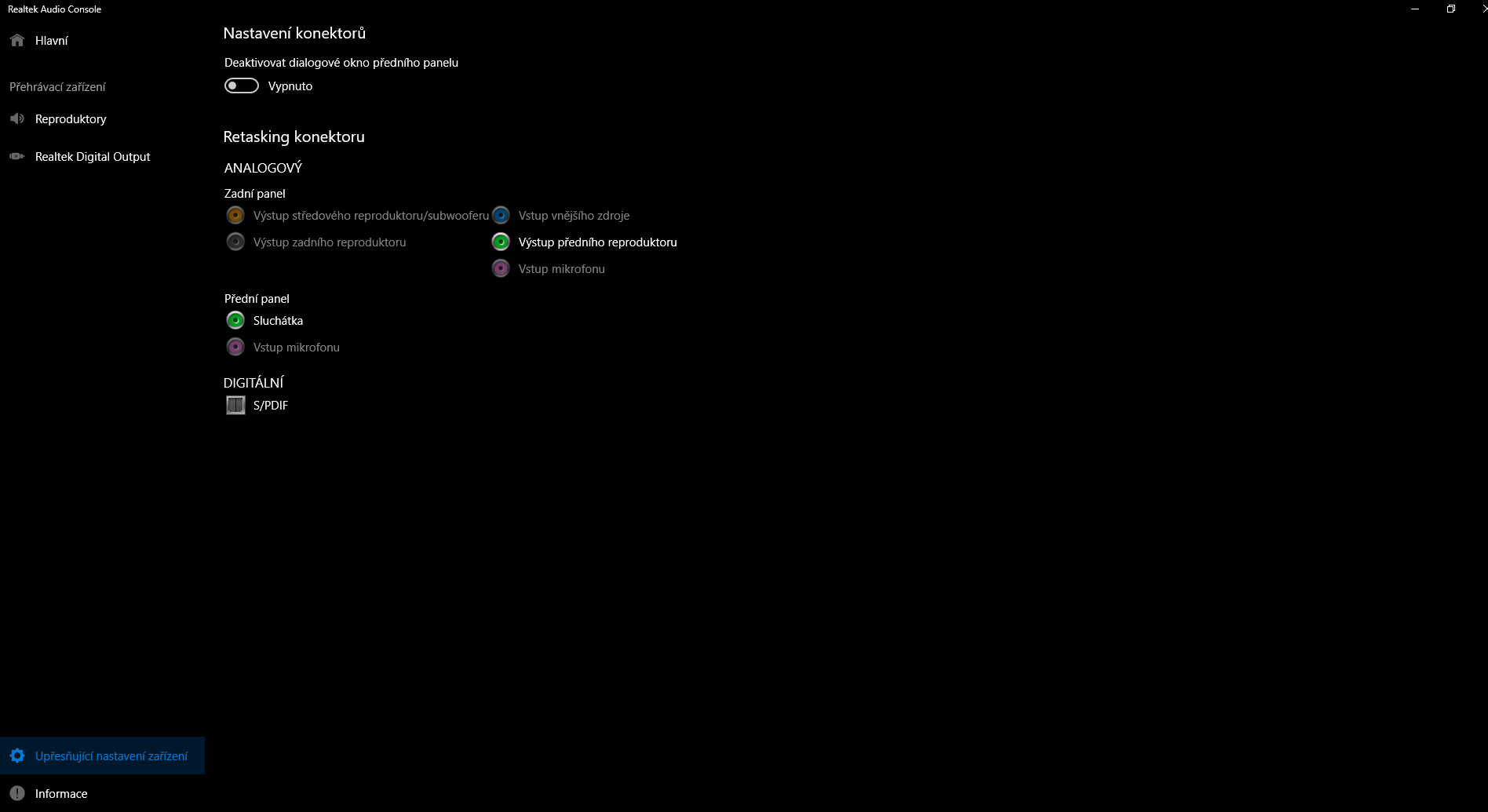 Jinak ano, automatickou detekci vypneš v aplikaci od Realtek. Je tam v nastavení používat obě zařízení/oba výstupy najednou nebo samostatně.