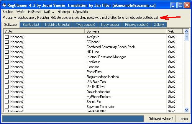 Nechápu, proč jsi označil a smazal vše. I když jsi ho použil poprvé, je to tam napsané dost jasně. Návod na použití RegCleaner bys tady určitě někde našel.