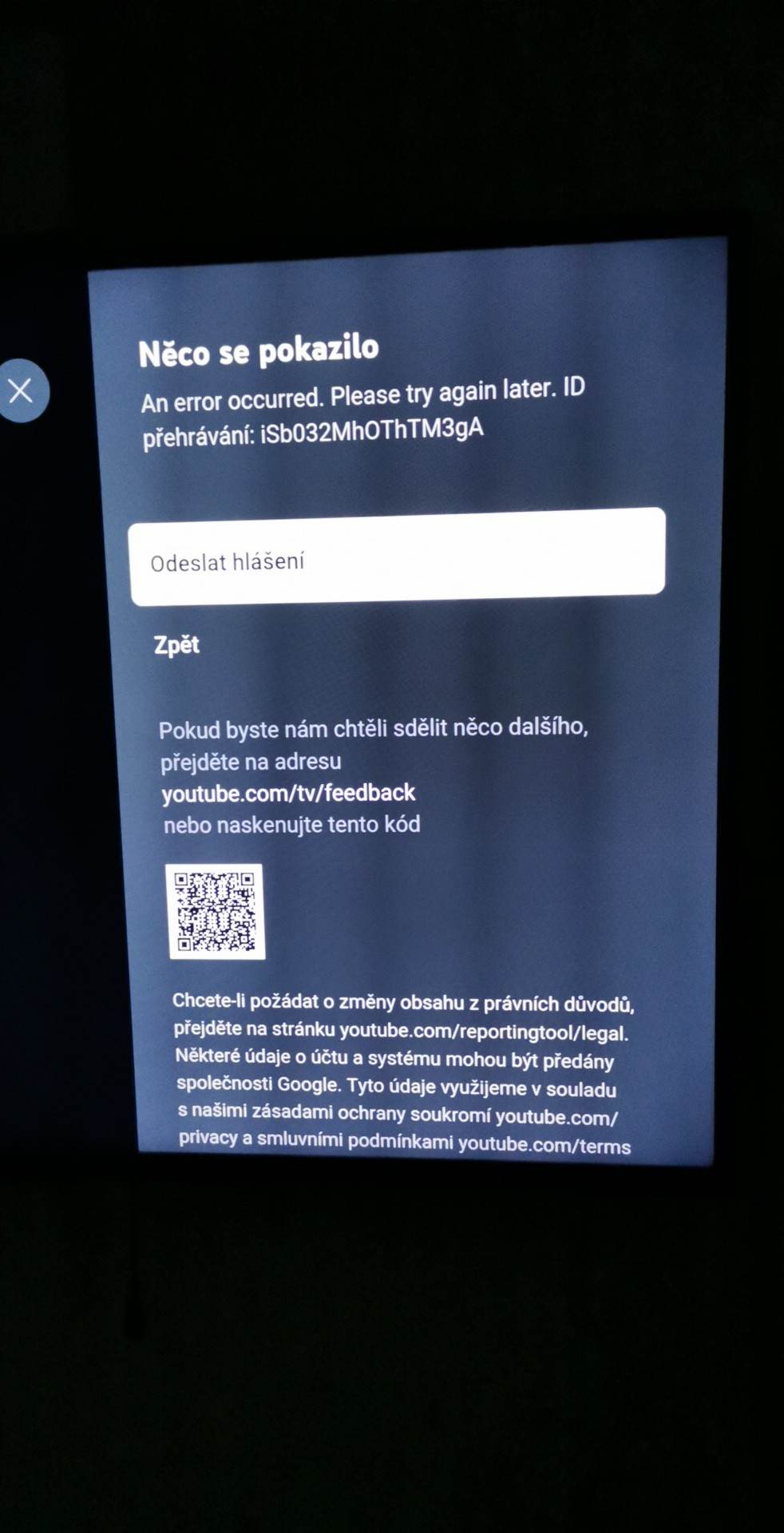 Zdravím, z ničeho nic mi přestalo fungovat Youtube na televizi. Když si chci něco pustit, tak to vyhodí chybu viz příloha. Zkoušel jsem jiný účet a vymazat mezipaměť, nepomohlo.
