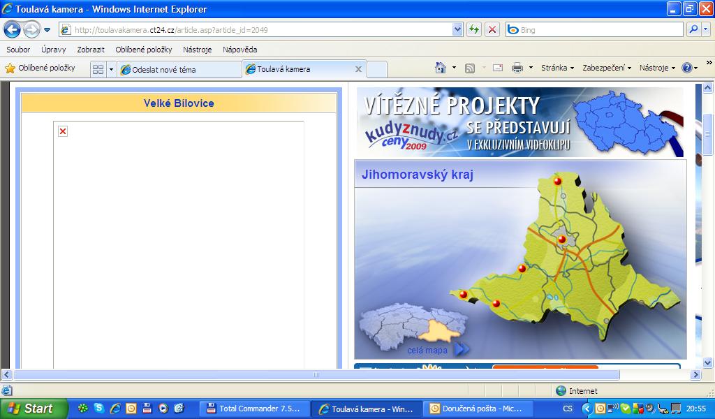 Jen upřesním můj problém, stránka se zobrazuje tak jak má, to nemá chybu, chyba nastane až tehdy, když kliknu na to video tou "pěstičkou s prstíkem" a kliknu v domnění, že se spustí přehrávání videa. Bohužel obrázek, tedy ten modrý čtvereček, viz. přiložené foto s nápisem "Toulavá kamera, spustit video a šipka" zmizí a nic se neděje. Viz můj první obrázek v této debatě. Když na tom PC spustím Operu, tak se to normálně přehraje, přehrávače WMP i KMP normálně přehrávají.