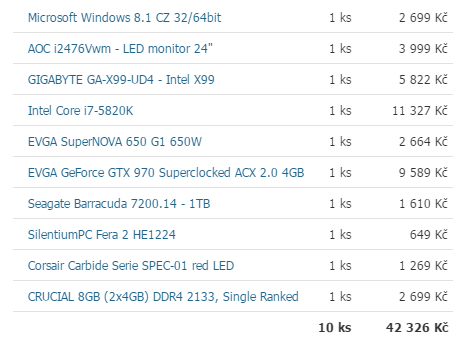 To Martab: Souhlasím, ceny šly nahoru, koruna je slabá. Jen si myslím, že je lepší v něčem ubrat a koupit perspektivnější variantu do budoucna. Case se dá koupit levnější, je to otázka priorit, stejně tak paměti. Souhlasím s někde výše popsaným, že 8/16 Gb není pro běžného uživatele rozdíl. Možná u toho střihu videa. Mám 16 gb RAM a málokdy využiju polovinu z toho, používám zbytek občas jako ramdisk pro zrychlení výpočtu do školy.