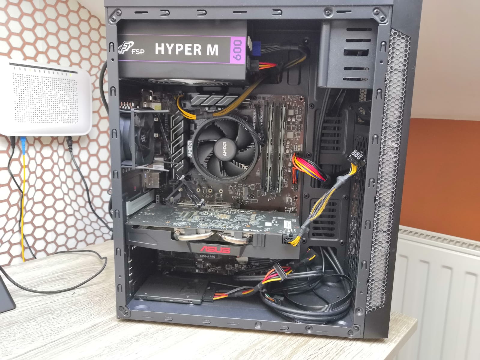 Dobrý deň, posielam foto ako vyzerá moja bedna, zostava je: procesor AMD Ryzen 3 1300X, základná doska MSI B450-A PRO - AMD B450, Grafická karta AMD rx 570 4gb, jeden krát SSD, zdroj FSP Fortron Hyper M 600.