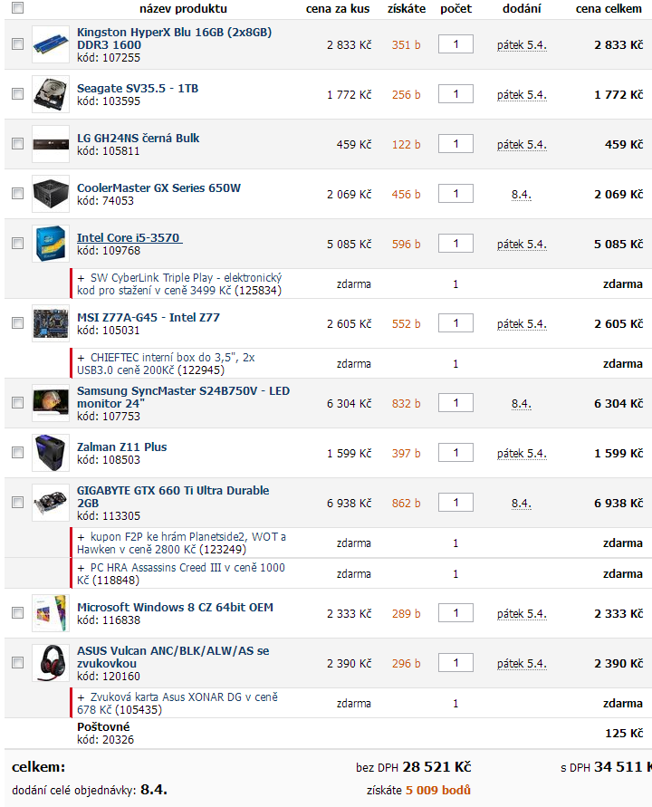 Moje zlatíčko: CPU i5-3570, MB: MSI Z77MA-G45, RAM Corsair Ventage 2x8GB, GPU: Gigabyte GTX680 OC 2GB, Zdroj: CoolerMaster 650W GX serie, HDD: Seagate Baracuda 7200.14 1TB server , CASE Zalman Z11,