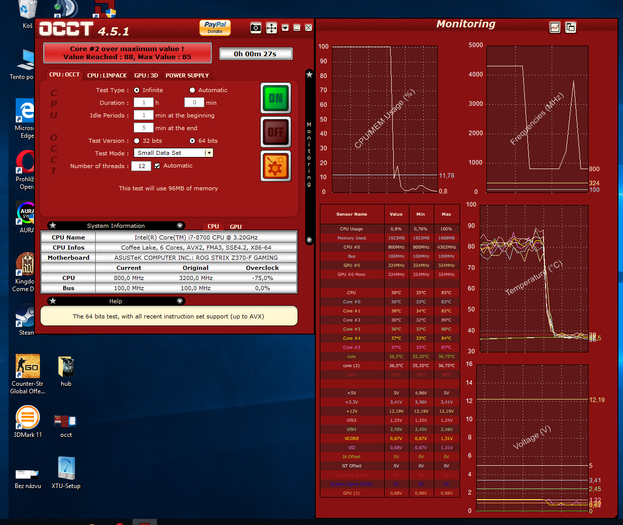 casperdeluxe: OCCT má totiž nastavený výchozí teplotní limit právě 85C na CPU. Pokud to tuhle nastavenou teplotu překročí na asi více jak 5-10 sekund (nevím přesně), tak OCCT už zastaví test. Můžeš ty výchozí hodnoty zvýšit z 85 na 90. Když klikneš na tu oranžovou ikonu s tím nastavením, tak tam je můžeš upravit, jak potřebuješ.