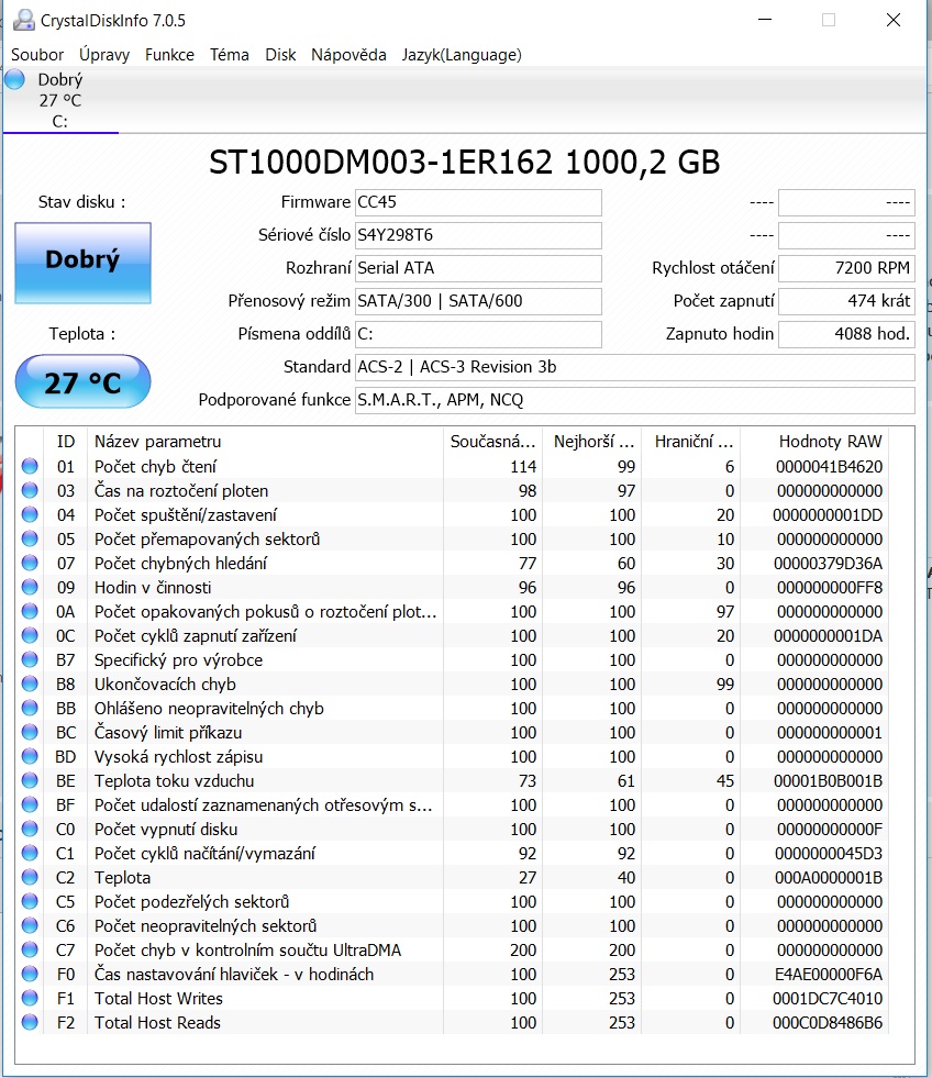 Tady je výpis z Crystal Disk Info. HDD jsem kupoval nový někdy v létě 2015 a podle té tabulky se zdá být v pořádku.