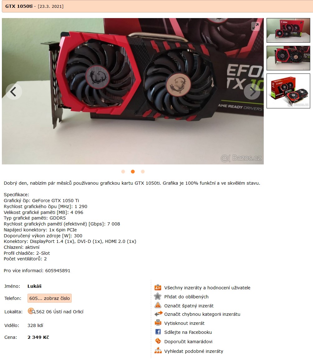 Díky za odpověď! Je mi jasné, že tam MSI Gaming bude nejspíš nejlepší. Nejsem si ale jistý, jestli se mi chce dát 4k za použitou 1050 Ti... Pár měsíců zpět jsem viděl prodávát https://pc.bazos.cz/inzerat/134079019/a ... ti-4gb.php za 2,5k, mrzí mě, že jsem ji nekoupil, ale s tím už nic nenadělám. Jde mi hlavně o poměr cena/výkon/životnost. Jak jsem psal výše, bude to nejspíš dočasné řešení, proto bych za to nechtěl moc utratit.