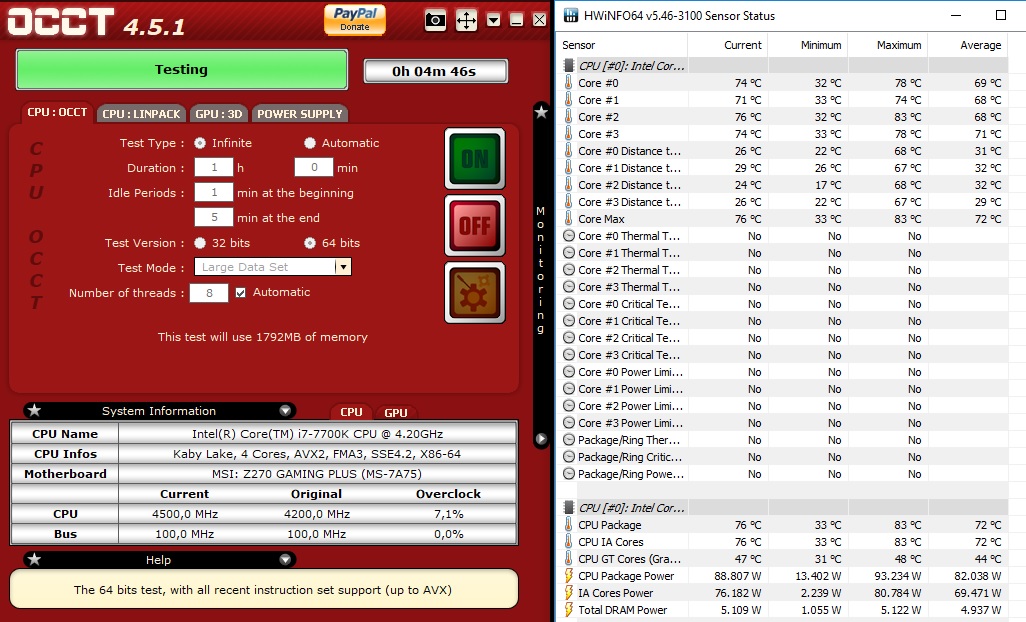 U přetaktování se trochu zdržím. Káčkové procesory Kaby Lake Core i7 jsou známy tím,že teplovodivá pasta mezi samotným jádrem procesoru a IHS (kovovým roznašečem tepla) není moc kvalitní a tudíž procesory dosahují vysokých teplot a nebo jejich chvilkových výkyvů. Je to skutečně tak - teploty v intenzívní zátěži byly vcelku vysoké i na základním taktu.Výkyvy zas tak hrozné nebyly ale kolísalo to i o 10°C. Řešením by bylo oddělení IHS a odstranění původní pasty,tzv. Delid procesoru.Je to poměrně riskantí práce a samozřejmě přicházíte o záruku.Proto to nedoporučuji.Teploty do 85°C nejsou zas až tak kritické i když oproti skutečně chladnému Core i5 6400 je vnímám jako vcelku vysoké.