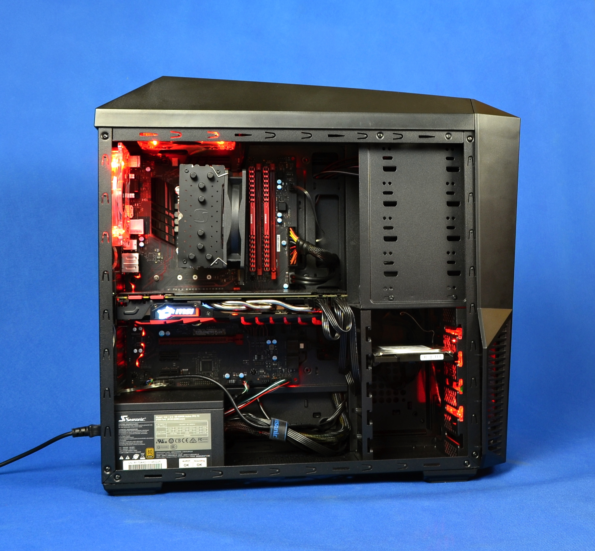 Case : Zalman Z11 Plus HF1 - Černo červená case s trochu extravagatním designem je dostatečně prostorná.Je osazena pěti ventilátory a cenově je na tom velmi dobře.U ventilátorů se trochu pozastavím.Tři červeně podsvícené (800 ot/min) jsem tam nechal a dva menší (osazené v předu ve vypouklých bočnicích jsem demontoval.Měly tam být asi kvůli chlazení disků,ale pokud je ve předu jeden 120 mm ventilátor,tak jsou tam zbytečné a jen by narušily airflow ve skříni.