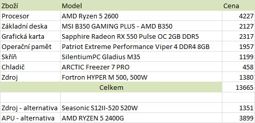 určitě je lepší volbou R5 2600 a RX550 jako zobrazovadlo, každopádně paměti chceš určitě 16GB, takže ten modul brát dvakrát, stejně tak větrák... jinak "semtam nějakou tu hru" si rozmysli, ať se tam případně dá silnější grafika (záleží co hraješ)...