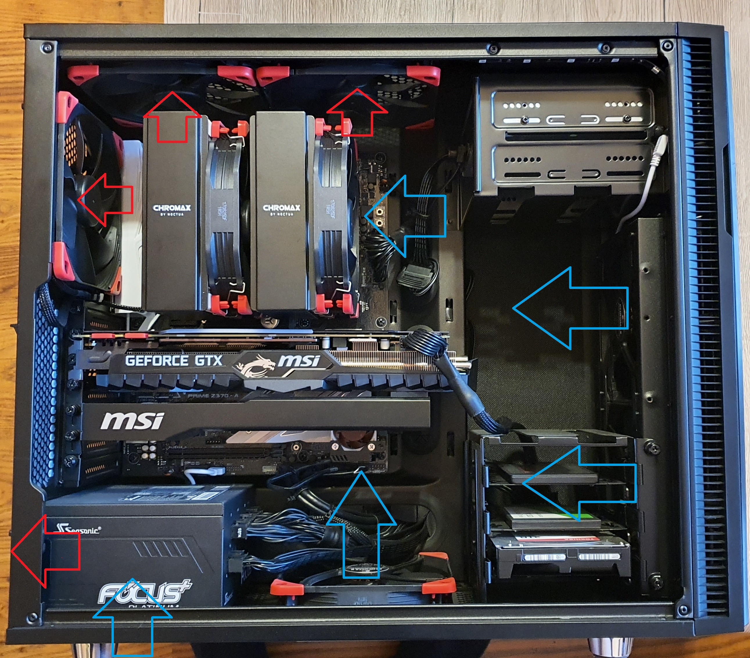 Ale vždyť o tom se tu snad ani bavit nemusíme, to je jasná věc. Proč mám asi stejně jako drtivá většina uživatelů ventilátory tak jak na fotce?? Zespoda a zepředu chladný dovnitř a zezadu a nahoře ohřátý ven! Proč už výrobci skříní nedávají možnost zabudování zdroje nahoru do skříně?? Dole je to prostě pochopitelně lepší jak jsem říkal, jelikož nasávání i výfuk zdroje jsou mimo skříň. Ukažte mi někdo někoho, kromě petr22 , kdo si do skříně namontuje zdroj ventilátorem nahoru?? Neviděl jsem snad ani video o stavbě PC (a to i profíků), kde by někdo dával zdroj obráceně i když netvrdím, že když jsem to já neviděl, že to ještě pár jedinců neudělalo a ještě to třeba neprezentovalo na Youtube. To je s odpuštěním jen výplod "něčí" fantazie.