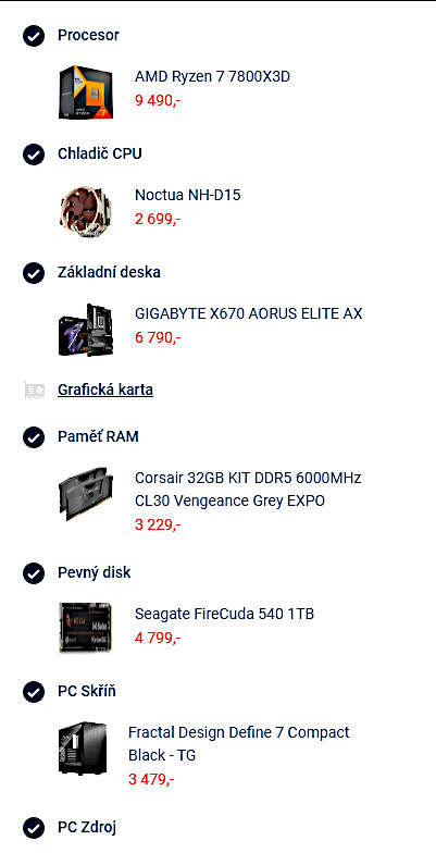 Ono jedna věc je, že "o peníze ti nejde tak moc", další věc je ty peníze úplně vyhazovat z okna. Ten disk ber třeba https://www.czc.cz/kingston-ssd-kc3000- ... 97/produkt, ty rozdíly mezi jednotlivýma NVMe diskama stejně v 95% případů nepoznáš. Důležitý je, aby měly DRAM cache a využívaly rychlosti PCI-E sběrnice podle verze (tedy pro PCI-E 4.0 nějakejch ~7000 MB/s). Jestli chceš něco úplně top, tak můžeš přihodit třeba na https://www.czc.cz/samsung-ssd-990-pro- ... 54/produkt. Jestli nebudeš potřebovat dedikovanou grafiku, tak do toho můžeš dát https://www.czc.cz/amd-ryzen-7-8700g/392023/produkt. Za desku pak taky můžeš ušetřit, třeba vzít tuhle - https://www.czc.cz/msi-mag-b650-tomahaw ... 71/produkt. Jinak třeba můžeš zvážit, jestli bys využil víc jader, jestli děláš dost multitaskingu, to je tak jediný, za co bych možná připlácel. Case třeba tuhle - https://www.czc.cz/endorfy-arx-500-air/378844/produkt, chladič bude stačit https://www.czc.cz/endorfy-fera-5/362188/produkt, max. tak https://www.czc.cz/endorfy-fortis-5-dua ... 92/produkt.