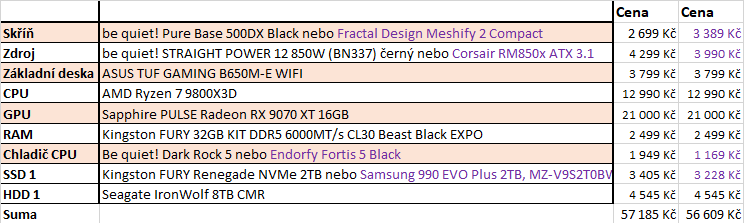 Mám takovou představu, že bych vzal nějakou desku s AM5 + 2x16GB DDR5 + 9800X3D + CPU chladič + nějakou verzi 9070XT + 2TB SSD + 8TB HDD