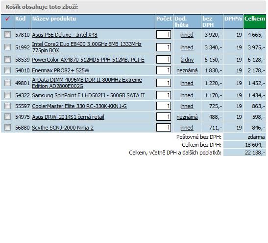 CPU:Intel Core 2 Duo E8500 3,16GHz@3,80GHz,MB:ASUS P5Q Pro,GK:Gigabyte GTX 260 OC,RAM:Corsair DHX 4GB CL4,HDD:Samsung F1 250GB+640GB,ZDROJ:Seasonic 550W SS-550JT,LCD:Samsung 22´´T220,CASE:Acutake VIPER 2 black/red,ZVUK:Asus Xonar D1,SYS:W7.