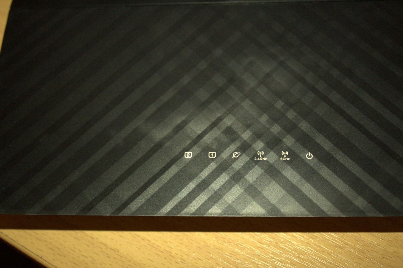 Zleva máme indikační diody pro aktivní LAN porty, další dioda je pro signalizaci, že je zařízení připojeno k internetu a následující dvě diody jsou signalizací pro provoz 2.4Ghz či 5Ghz pásma. Nejvíce napravo je pak diodka signalizující, že je router zapnutý.