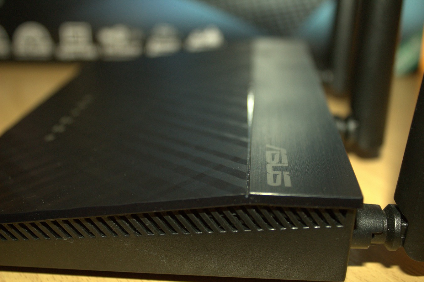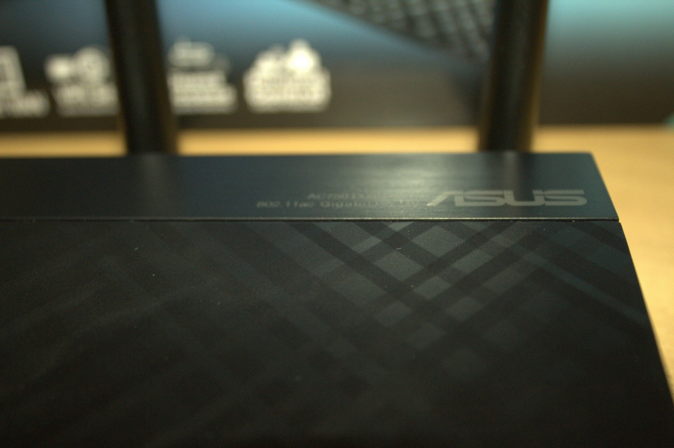 Na první pohled si můžeme povšimnout krásného šrafovaného designu routeru, kdy v horní části routeru přístroj ještě dále zdobí pruh z jakoby leštěného černého plastu, což jen podtrhuje celkový luxusní dojem z celého routeru.