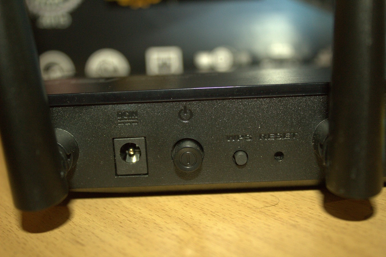 Zde si znovu všimneme toho, že je router vybaven trojicí antén. Když to budeme brát zleva, tak mezi první a druhou anténou je zdířka pro připojení napájecího kabelu, zapínací tlačítko, tlačítko WPS a reset dírka.