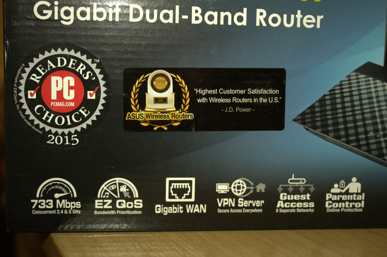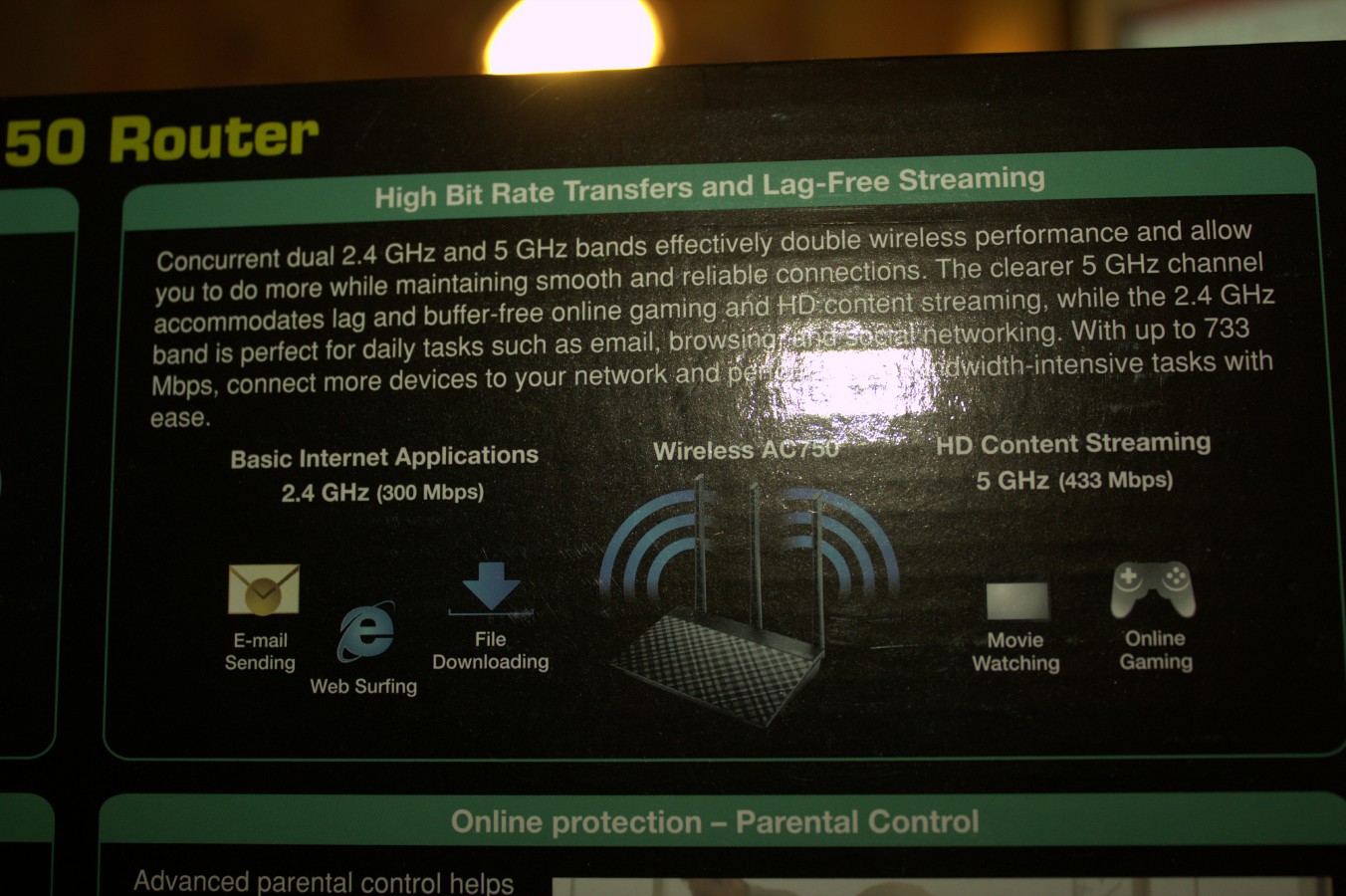 Zepředu na krabici dále vidíme, že je router umí vysílat jak 2.4Ghz, tak 5Ghz pásmo. Dále si můžeme všimnout, že má router priorizaci jednotlivých úkonů a programů, disponuje Gigabitovým WAN konektorem, že lze vytvořit až 8 separátních WiFi sítí a že router disponuje rodičovskou kontrolou.