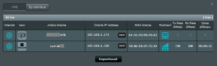 Taktéž zde můžete získat informace o připojených zařízeních. Seznam lze vyexportovat do formátu csv.