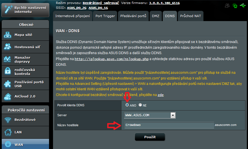 Router vám podá zprávu o úspěšné registraci - zde jméno "Crowdowo" :-)