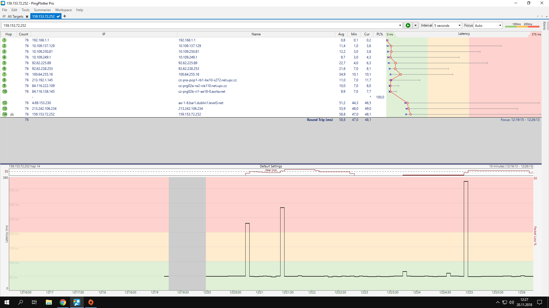 Vlož sem screen z programu PingPlotter. Taky můžeš napsat jaký typ připojení máš a jakou konektivitu, poskytovatele.