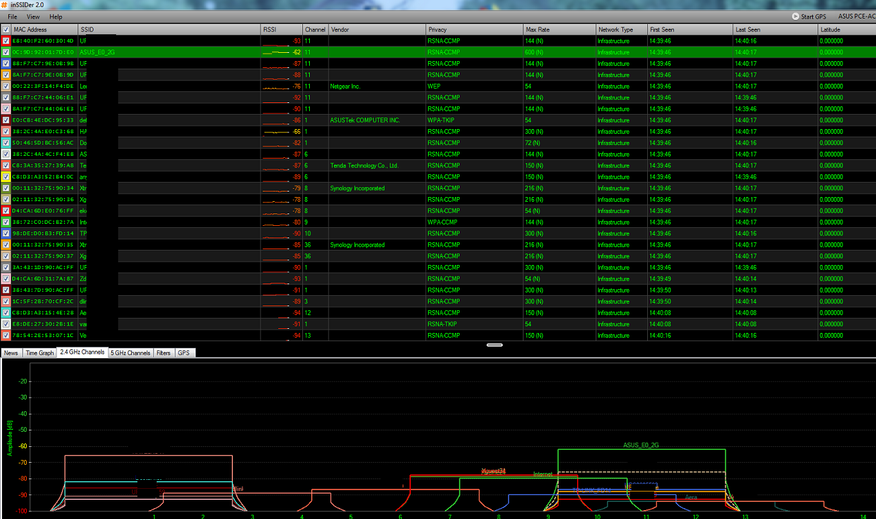 Testování routeru probíhalo v běžných podmínkách, prostým kopírováním souborů. Rychlost kopírování převzata z totalcommanderu. K portu WAN připojen počítač s gigabitovou LAN kartou, SSD disk. Jako příjemce pak počítač s gigabitovou LAN a SSD diskem. Notebook HP ProBook s WiFi kartou podporující 802.11n. Jako další WiFi karta použita https://www.asus.com/cz/Networking/PCEAC68/ ve stolním PC s SSD diskem. Jako USB zdroj byl použit flashdisk Corsair VoyagerGT USB 3.0. Písmena značí vzdálenost od routeru. A = 1 m, B = 4,5 m, jedna dělící zeď, C = 9.5 m, tři dělící zdi. A že to router neměl zrovna jednoduché, můžete vidět ze screenu InSSIDeru - celkem 30 WiFi sítí :-)