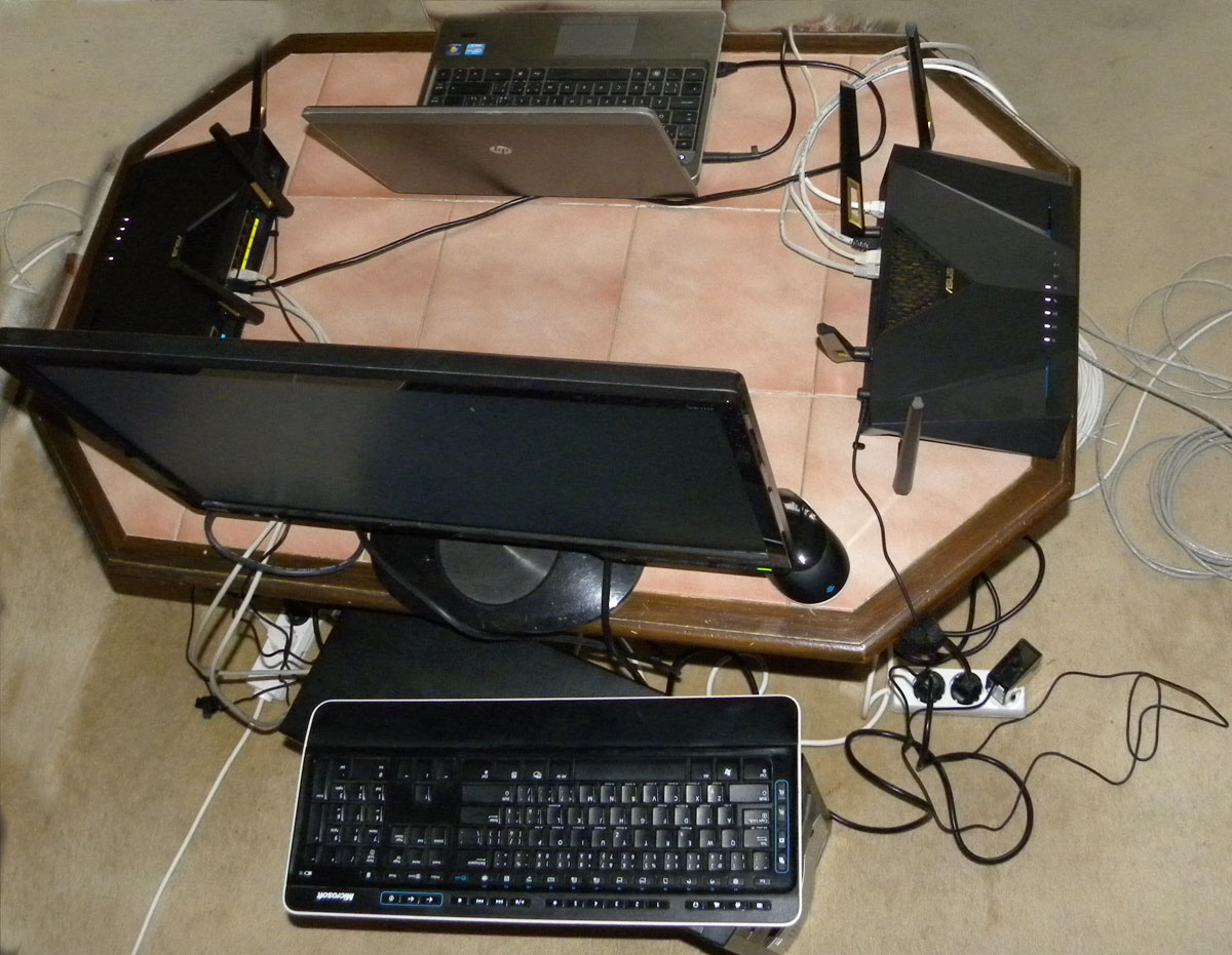 Budeme potřebovat ještě jeden router a dostatek síťových karet :-) První router zapojíme jako router. Do jeho LAN portů připojíme síťové karty (všechny tři jsem měl v jednom počítači). Druhý router zapojíme jako media Bridge a do jeho LAN portů opět tři síťovky (dvě ve stolním PC, třetí byl notebook). Celé to pak vypadá takto: