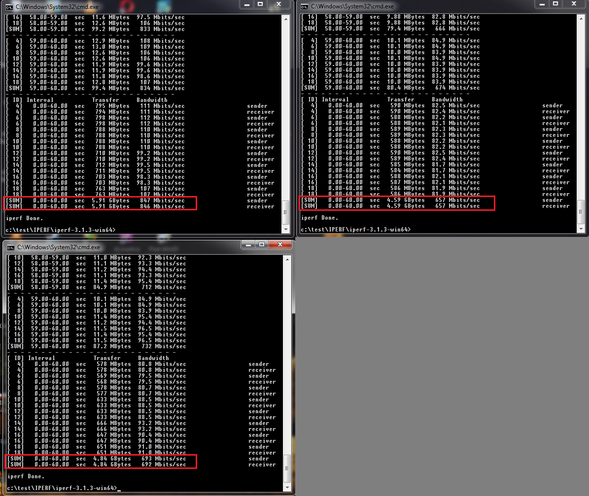 Základ by byl, ale obvyklé kopírování souboru, které používám pro rychlost se v tomto případě nehodí. Použil jsem program "iperf". Každá karta měla pevnou IP adresu, pomocí iperf jsem pak vytvořil tři komunikující dvojice. Na ntb a druhém PC nastavil naslouchání a na prvním PC, kde byly tři karty, jsem spustil tři testy. A zde je výsledek: