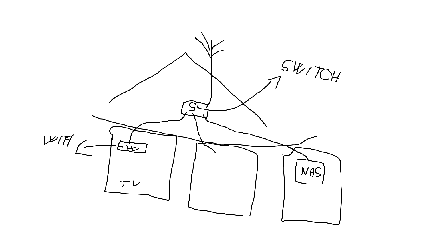 Potřeboval bych ale NAS přemístit do jiné místnosti a tam lze propojit jen kabelem (bez wifi routeru). Přikládám rychle vytvořené hnusné schéma zapojení.