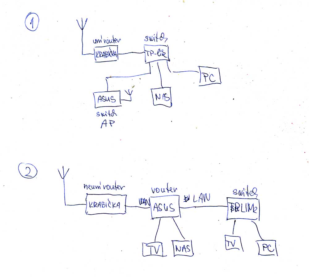 NEBO koupit nový router (bez wifi), ten zapojit za PoE napáječ a před switch. Wifi router v pokoji pak bude zapojen ze switche (z půdy) do LAN. Tento wifi router pak zapojím jako AP+switch a vše by mělo být v jedné místní síti - i když zapojím NAS v jiné místnosti (tedy do switche), tedy ne přímo do wifi routeru.