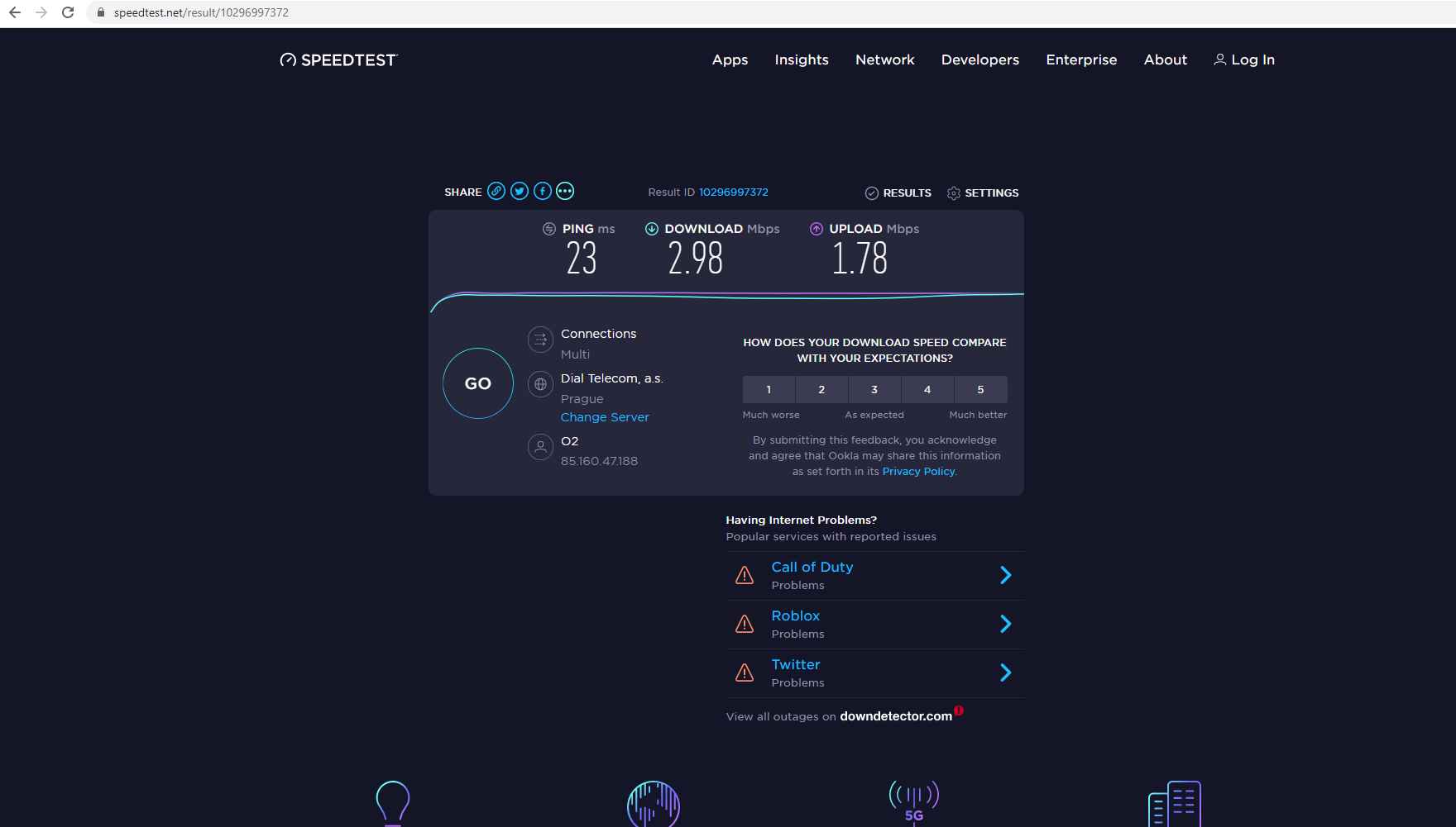 Internet mám od O2 a absolutně neodpovídá smlouvě. Stahovaní se pohybuje od 200kb - 1.5 mb/s. Doplňující informace pošlu, nevím odkud chcete screeny z testů.