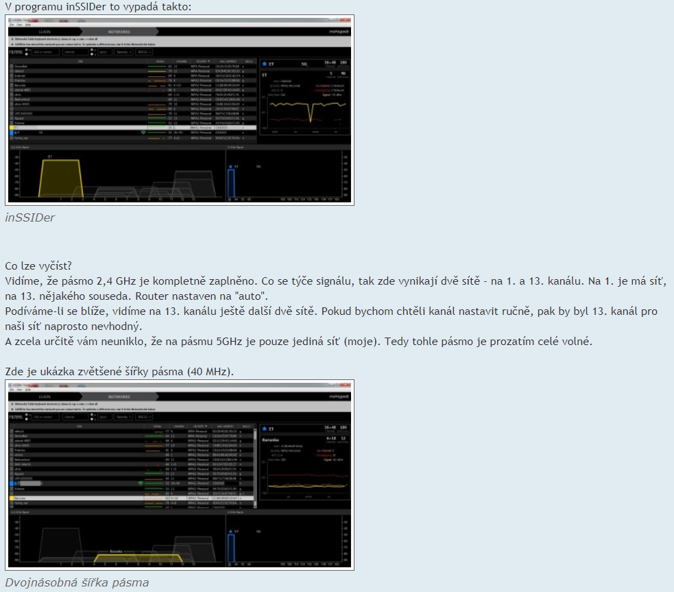 Abych ti to všechno usnadnil, dodal jsem ti odkaz na obrázek https://pc-help.cz/download/file.php?id=72392&mode=view , kde je vše vyvedeno v barvě, abys to měl snažší. A tam je vidět, že pásmo je zaplněno, nejmenší síla signálu je mezi 7 - 8 kanálem. Přičemž vlevo od sedmého kanálu je signál nepatrně vyšší, navíc je tam více sítí. Proto volen kanál 8.