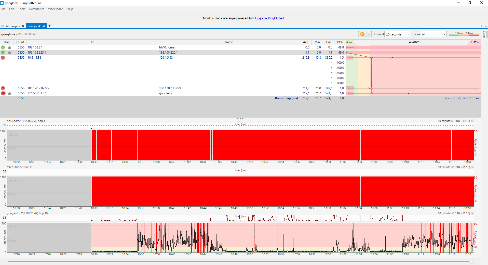 V posledných týždňoch zaznamenávam enormnú nekonzistenciu v pingu / packetlossu, hlavne v obedných hodinách. Keďže mám LTE internet, tak nejak som sa "zmieril" s tým, že jednoducho je vyťažená stanica, nedalo mi to, a tak som si dneska pustil ping plotter. Pokiaľ som informácie z neho pochopil správne, tak mi pakety ale padajú na routri (je to čínska no name plečka z telekomu). Medzi mojim PC a routerom je switch. Sú moje podozrenia na router oprávnené ? Ďakujem