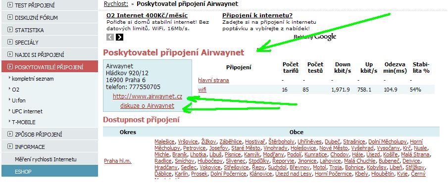 Vlevo klikni na Najdi připojení a vyber Praha hl.m. Dole pod čarou je 5 stránek poskytovatelů. Vyber toho který operuje v Bubenči, např. Airwaynet a klikni na jeho název. Pak už jen klikneš na jeho stránky a uvidíš co a za kolik poskytuje.