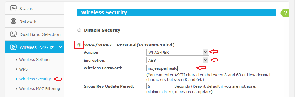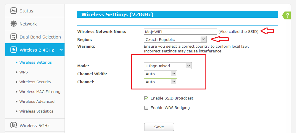 Pak vejdi do nastavení wifi, nastav SSID region atd. A pak nastav zabezpečení wifi (Security) Stejně tak nastavíš WiFi 5GHz.