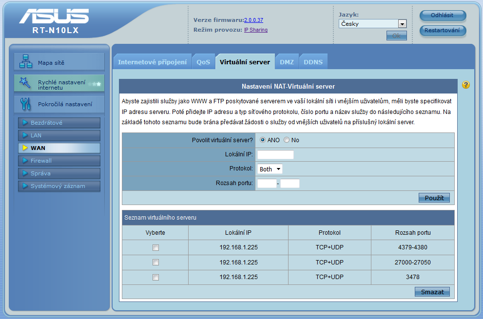 Pro tazatele: použij DMZ a zjisti se, že IP adresa 192.168.1.225 je zarezervovaná pro tvůj PC a skutečně ji máš od DHCP přidělenou (pokud nemáš nastavenou IPv4 na PC staticky).