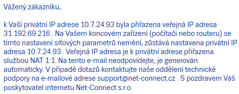 Provider zavedl do NATu nové pravidlo, proto píše: "k privátní adrese je staticky přiřazena veřejná adresa pomocí NAT 1:1 (Statický NAT)".