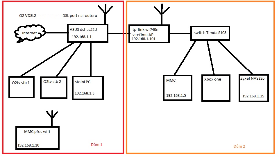 mám problém s novým routerem. Koupil jsem Asus dsl-ac52u jako náhradu za originál od O2 Zyxel VMG1312, který absolutně nestíhal, vzhledem k tomu že přes něj jely 2 O2tv, počítač, NAS, notebooky na wifi, mobily, xbox.. prostě dost věcí. :D Rozhodl jsem se tedy pro tento asus. Momentálně je síť zapojená takto: Asus, z něho vytažený kabel do 2 tv, PC a TP-linku WR-740N v módu AP, za ním switch a do něj MMC, xbox a NAS. Druhé MMC se připojuje zatím přes wifi na asus. Teď k problému: